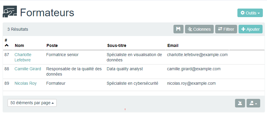 Les lignes affichées représentent les formateurs de la société. Dans Weemake, chaque formateur est un objet du type d'objet "***Formateurs***".