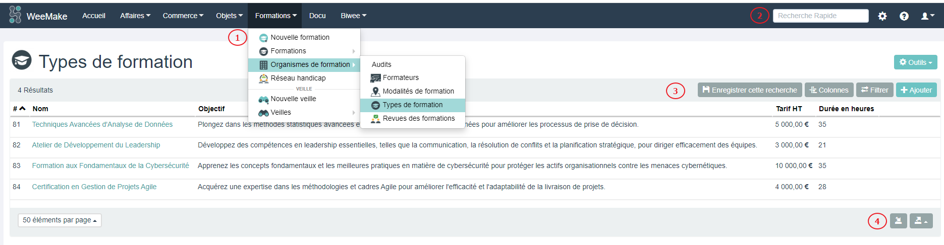 L'application métier s'organise autour d'un menu central horizontal et de sous-menus entièrement configurables (1). Un outil de recherche rapide, permet de rechercher parmi toutes les données, quelques soient leur type une valeur en particulier (2). Les listes de données sont paramétrables et filtrables afin de s'adapter au mieux à vos besoins en termes de présentation et restitution de données (3). Toutes les listes de données sont exportables et réimportables en CSV ou EXCEL (4).