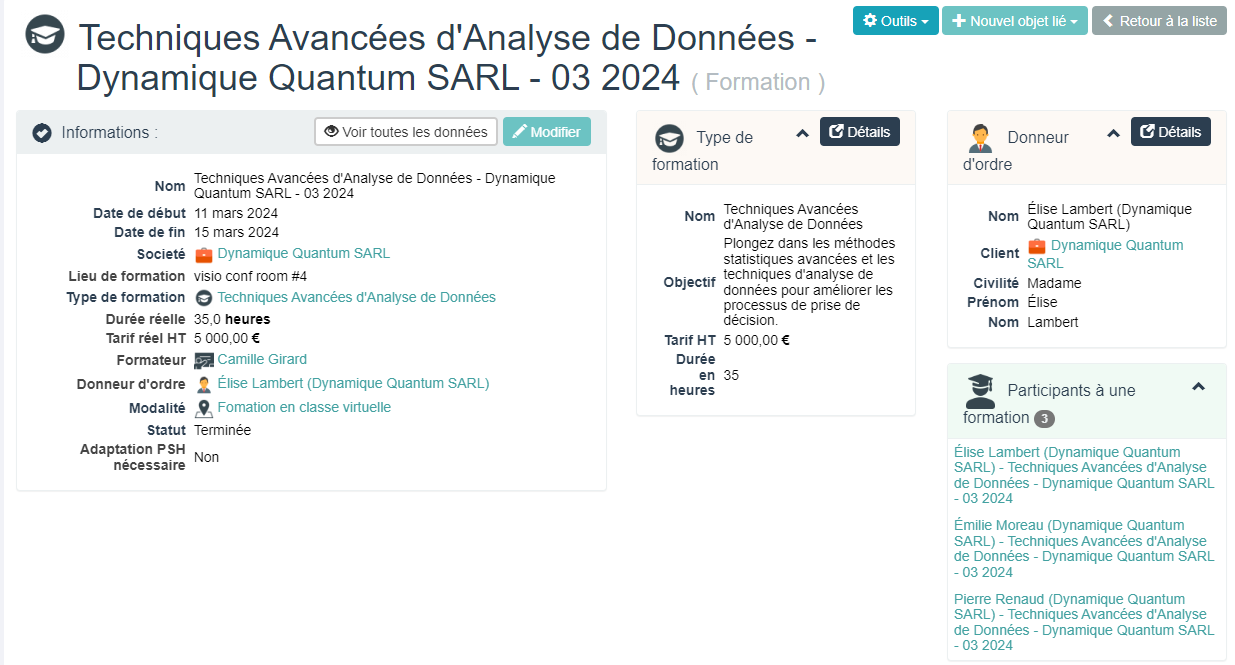 Par exemple, ci-dessous, sur la fiche d'une formation, nous voyons à quel type de formation elle est associée, le donneur d'ordre de la formation, ainsi que la liste des participants à cette formation.