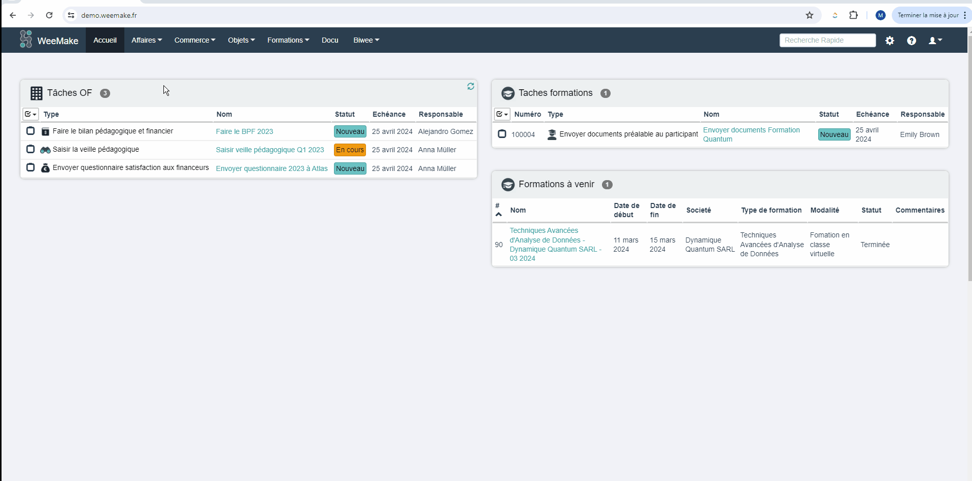 L'entreprise a des clients à former, des prestations de formation à dispenser, des formateurs à piloter, des formalités administratives à remplir ou encore des questionnaires à faire remplir par les participants.&#x20;