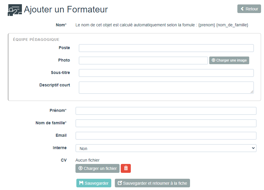 <figure><img src="https://3152486238-files.gitbook.io/~/files/v0/b/gitbook-x-prod.appspot.com/o/spaces%2F-MQBcl_cTuXeW45bHyWh%2Fuploads%2FqoAlMxXxGmsWvLOrBD4R%2Fimage.png?alt=media&#x26;token=e3a3abaf-dac7-4bf6-bcc5-26ddf8b0f403" alt=""><figcaption><p>Formulaire de saisie d'un formateur</p></figcaption></figure>