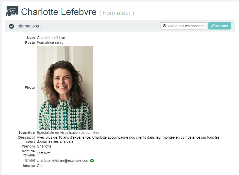 Vous pouvez cliquez sur un objet Formateur dans la liste des formateurs, pour accéder à ses données. Un clic sur ***Modifier***, permet de l'éditer.